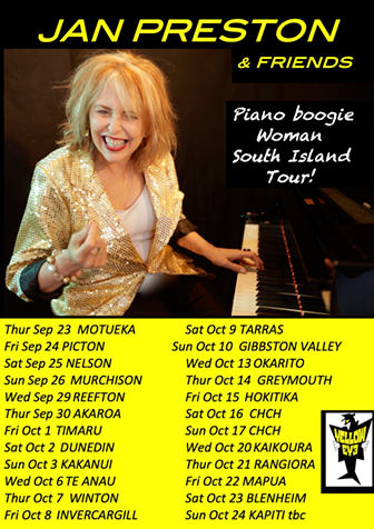 Following contracts composing soundtracks for documentaries, including sister Gaylene Preston‘s Helen Clark documentary My Year With Helen, Jan Preston, Aotearoa’s own queen of boogie-woogie, is taking her latest album, ‘Boogie Woogie Woman’, on a massive 24-date tour of Te Waipounamu – starting late September. NZM used the chance for a quick catch up with the internationally renowned powerhouse pianist, singer and entertainer.