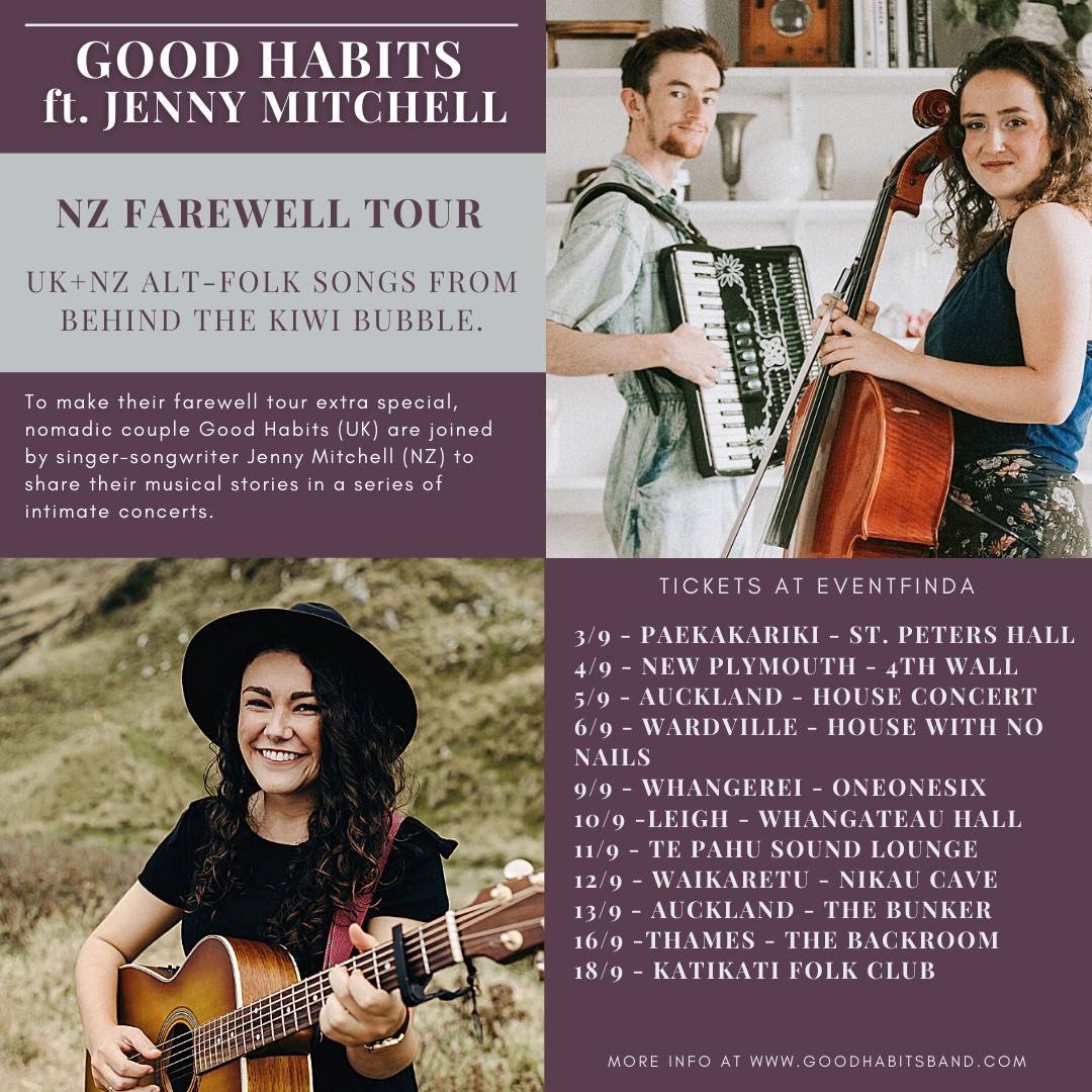 Let’s talk about your first spring tour first. What’s the premise behind the North island tour with Good Habits? Good Habits are an alt-folk duo from the UK, who have been happily stranded in NZ since our 2020 lockdown. I sat beside Bonnie at a morning yoga class at the Auckland Folk Festival earlier this year and the rest is history, I suppose! This tour will be their farewell to NZ and I’m super excited to be playing a bunch of beautiful little venues that I’ve never played before!