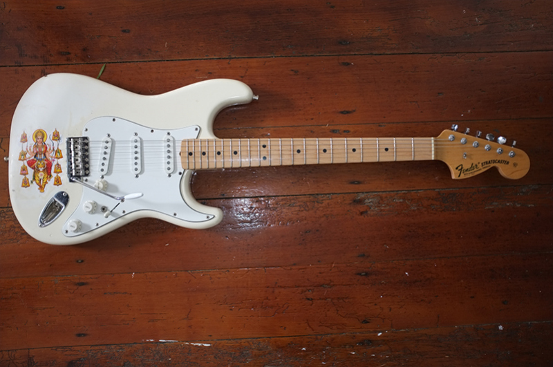 This is a bitser guitar! I’ve basically tried to recreate Jimi Hendrix’ most famous Woodstock Stratocaster – this is the closest I will ever come to playing that guitar. The Custom Shop neck is identical to the one he used. When I first saw the Woodstock performance at Auckland Art Gallery in 1994 it changed my life. Seeing Jimi on the big screen was like watching a being from outer space in human form. This is also on almost every song on the record.