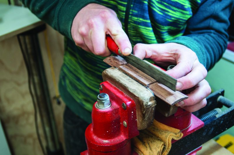 The tools he uses for this exacting task are marvellously old school – devilishly sharp small brass hand-planes, one of which is not much bigger than your thumb. He says these tools allow him to work at a pace that feels right to him. They remove the right amount of material with each stroke to allow him to gradually conjure the curves he is looking for. You might think this would be the most time consuming aspect of arch top building, but Trevor mentions later that sculpting the top and back takes him about five hours these days, while the total guitar build time comes to around a month.
