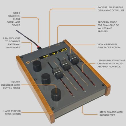 Designed specifically for cinematic and orchestral composers, the Lujin is gaining international recognition as a premium controller for integrating dynamics and expression into orchestral sample libraries. Winning praise for its build quality and intuitive controls, the unit’s handcrafted design combines modern functionality with a vintage analog look. The wooden sides and dark steel top intentionally mimic the aesthetics of classic early synths.