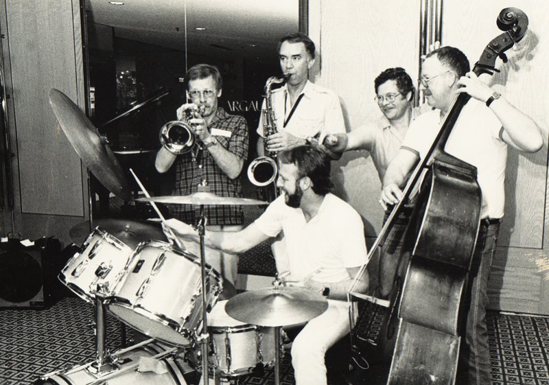 Space Case in Singapore: Frank Gibson Jnr (drums), Kim Paterson (trumpet), Brian Smith (sax), Murray McNabb (piano), Andy Brown (bass).