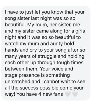 I’m fitting seven or eight songs in my set and one of my most recent releases, Sister, has proven one of the most rewarding to play. There are Kasey fans of all ages in the audience every night, and I’ve met sisters of all ages and generations after the show who are connecting to that song. That’s been really special! I’ve also been so blown away by how many people have taken the time to not only follow me online, but message me after show too – this is one of my favourites.