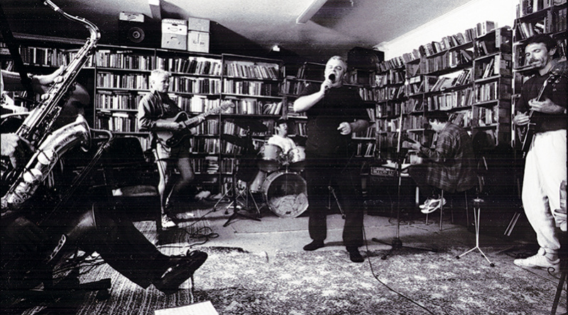 Jive Bombers at Green Door Books, Auckland 1997. From left: Michael Croft – tenor sax, Chris Watts – tenor sax, Wayne Baird – guitar, Rick Cotter – drums, Rick Bryant, Tony McMaster – bass, Cadzow Cossar – guitar.