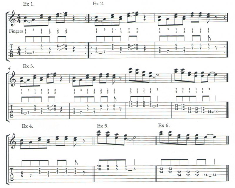 Example 1 shows a one bar rhythm riff with two notes from a C major triad at the fifth fret. In this example the first finger will partially bar the fifth fret notes while the third finger plays the seventh fret notes. Then there is a little slide up with the second and third fingers to the C shape triad at the eighth fret. If you know bar chords you should be able to see that these notes are from those bar chords you already know.