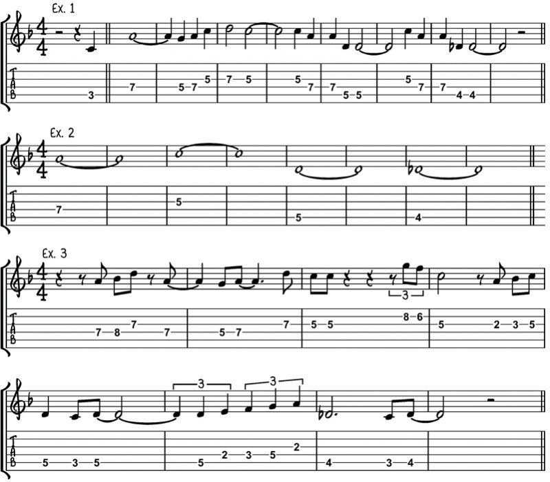 Just play these notes (in this case each note lasts two bars) over the chords. Use a backing track, loop the chords, or get someone to play them with you. Take your time and listen to how the notes fit with the chords, and also how they are part of the whole melody. It’s also good ear training. Once you are comfortable with the notes as written, try them an octave higher, eventually being able to play them all over the guitar in any octave. Take your time with this.