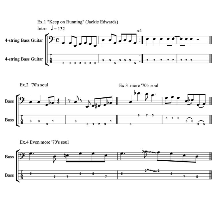 I have transcribed four excerpts from 1960s tracks that were all played with a pick, the first being the track that started me on bass when I was 13, Keep On Running by the Spencer Davis Group, composed by Jackie Edwards. I was learning the trumpet then, but this track changed everything.