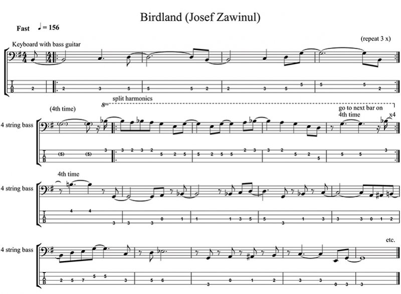 Birdland opens with three 4 bar phrases played with an ARP 2600 (try finding one of those these days!) using a figure one octave below bass guitar with the bass guitar coming. I have written the part an octave higher for four-string bass but it can be played like the recording on a five-string bass.