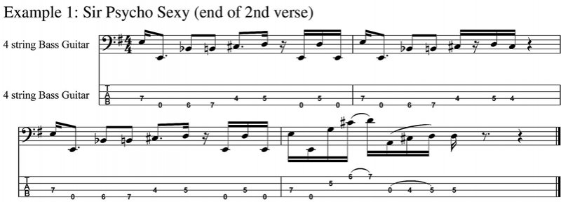 The first example, four bars from the end of the second verse of Sir Psycho Sexy, has a Bb (third note in) rising to a B followed by a C# rising to a D, suggesting a half/whole tone diminished scale. These notes are, however, part of Flea’s familiar use of passing notes. Also, Flea always picks firmly with an element of staccato (represented by the dots over the notes), often to the point of overdrive. This track features the use of an envelope filter, which apparently had a weak battery, adding to the overdrive and which would have been touch responsive – the harder the picking, the more effect.