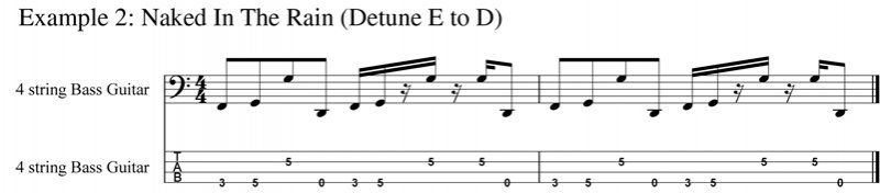 The second example, taken from the opening of Naked In The Rain, can be played easily with the fourth string, open E, detuned to open D.