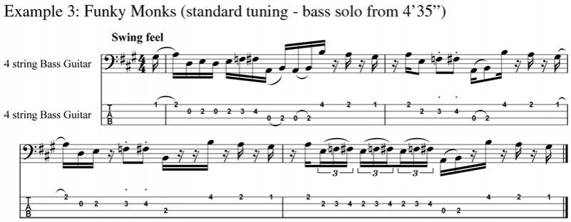 The final example, Funky Monks, can be played between frets 1 and 4, with some open notes on strings two and three. It is played with a swing feel and it is basically B Dorian (B,C#,D,E,F#,G#,A,B). It is taken from the final bass solo at around four minutes 35 seconds. The arches across the notes represent slides or hammer-ons with the G# sliding onto A on string one followed by a hammered open D to E on string two. Notice the further use of chromaticism with the E to F (a passing note) to F#.