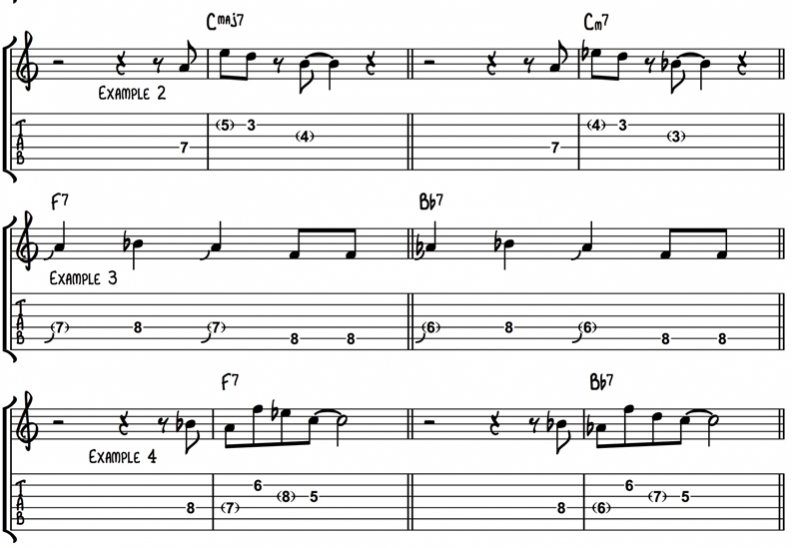 Finally, in Example 4 my F7 phrase contains A and Eb (3rd and b7th respectively). To fit Bb7 these become Ab (b7th) and D (3rd).