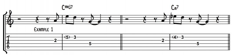 In Example 2, I played a phrase that included the 3rd and the major 7th (E and B) over the Cmaj7. To fit over Cm7, we’re going to alter these notes to Eb and Bb, giving us the b3rd and b7th of the chord.
