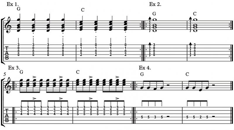 Exercise 1 gives you a chord progression using a bar of G and one of C, and within it are partial chords. Under beats 2 and 4 are dots which indicate a staccato note meaning to stop it just after you play it. So it sounds like – long, short, long, short. This is a type of rhythm part you hear a lot, but many players miss. It really is a good thing to get used to doing as little things like this can take your playing to the next level.