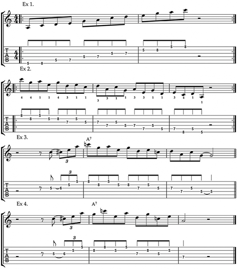 Looking at Exercise 1 you can see an A Minor Pentatonic scale in the 5th position. If you don’t know this scale yet then it would be a great idea to get it under your belt quickly as it’s a common scale used in many different genres of music, including rock.