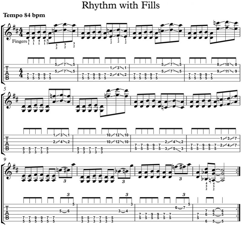 In the first two lines of the music/tab, the first two and one half beats of the bar are commonly called a ‘shuffle’ rhythm, while the last one and a half beats contain the fill. The shuffle would be best played with a pick in a strumming style. The fills on these lines are 6th intervals for which you’d be best to use a hybrid picking style (pick and 3rd finger).