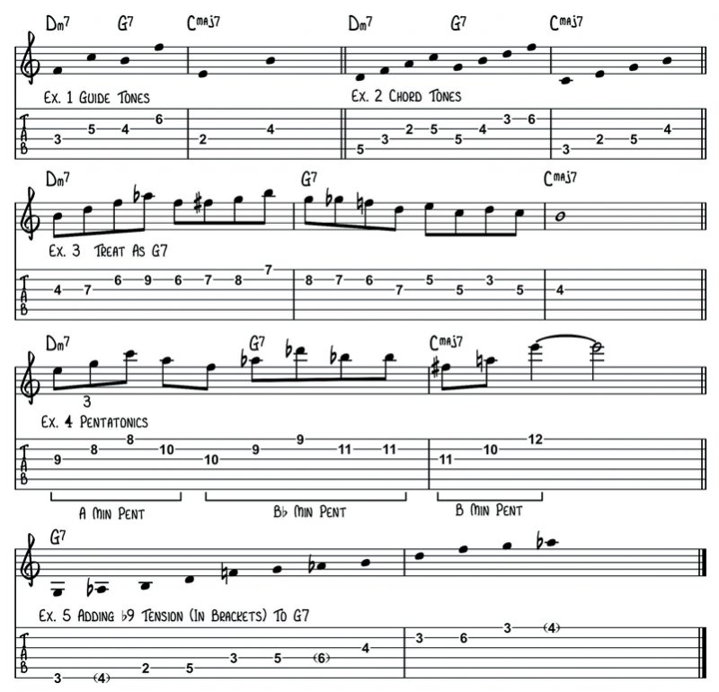 Step 4 superimposes pentatonic scales. Solo using A minor pentatonic over Dm7, Bb minor pentatonic over G7, B minor pentatonic over Cmaj7. This will have the effect of introducing considerable tension over the G7, together with the #11 over the Cmaj7. One way of doing this is simply to move a similar motif through each scale (as in example 4).
