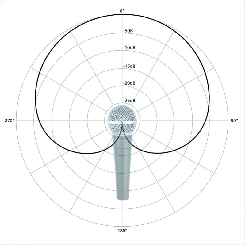 The term cardioid references the way in which these microphones pick up sound – reminiscent of a heart shape – and can be seen in a microphone’s polar pattern chart which is usually supplied by the manufacturer. The chart defines the front of the microphone as 0° and the back as 180° while everything else is more or less in the sides. The heart-shaped line tells us that if a sound is being produced anywhere other than 0° on-axis with the microphone it will be quieter, even if it remains at the same distance.
