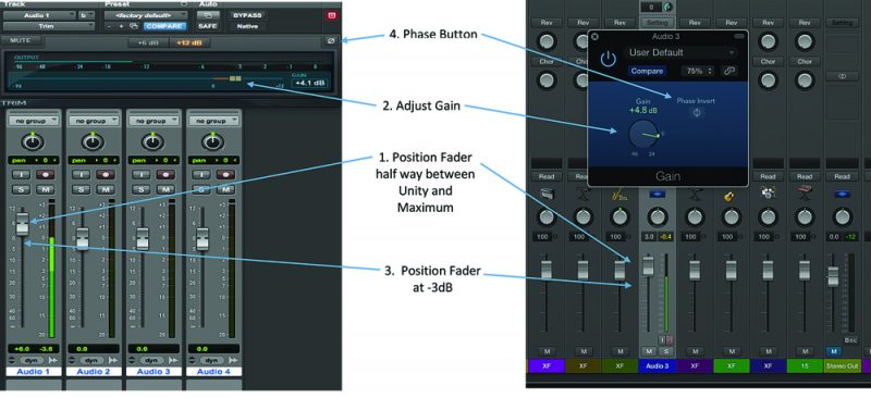 To achieve uniformity, take each individual fader and position it half way between unity (0dB) and the maximum level. Play the signal through the track and adjust the gain either up or down so that the signal peaks at unity. Once the gain is set, lower the fader to -3dB. If you apply this process to each track you will be making decisions based on equal volume. It also has the added benefit of ensuring that an appropriate level is going into your plug-ins to help them work in an optimal manner. (See graphic below.)