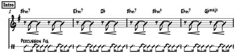 The song opens with a subtle layering of three interwoven percussion figures (reverse cascara, woodblock and a soft click) which create a subdued yet driving rhythmic bed. I heard the main part as a reverse cascara pattern. Cascara is usually played forte on the ‘shell’ or outside of the timbale drum, a fundamental propulsive element in Afro Cuban music. Here we see a ‘reversed’ pattern (on the lower staff):