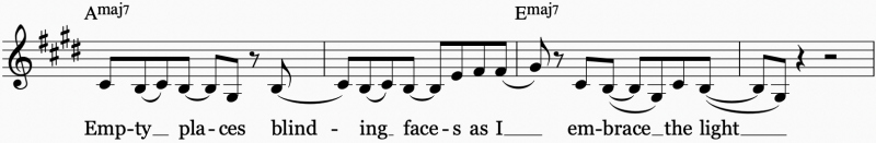 As we move into the chorus (CCC) the opening gesture shifts upward again to a G#, the 7th of the chord (Fig. 3). As the song progresses through the verse and chorus, the focal melody note moves higher up the chord tones of the underlying Amaj7 chord, creating a sense of upward movement.