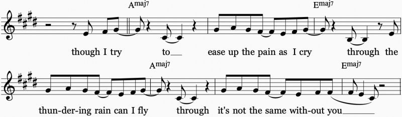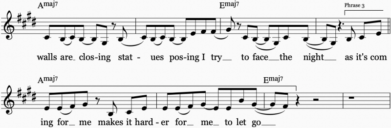 The rhythmic changes discussed above occur simultaneously with changes in melodic register. Phrases 1 and 2 (AA) of the verse are based around C#, the 3rd of the underlying Amaj7 chord, and have a range of one octave, from G#3 to G#4 (Fig. 1). As the rhythm changes in phrase 3 there is also a shift in register. Phrase 3 and 4 (BB) are more arch shaped than the stepwise motion of the previous phrases, and the opening gesture climbs up to an E, the 5th of the chord, with a range from B3 to B4, resulting in a slight upward lift (Fig. 2).