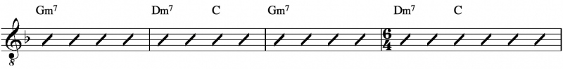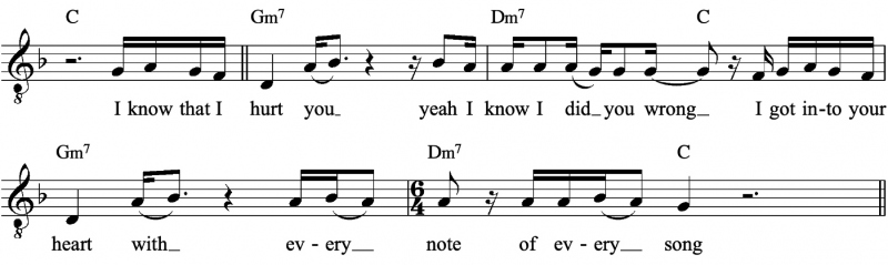 The pre-chorus (Fig. 5) is four bars long but the final bar has a 6/4 time signature, creating an impression of an extra couple of ‘floater’ beats attached to the end of the final bar.