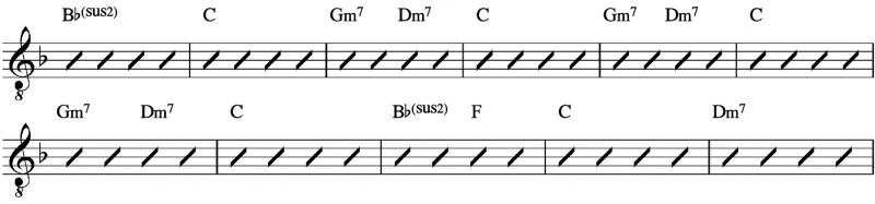 The intro/verse progression begins on the dominant chord before resolving to the tonic at a metrically weak point before quickly moving away, creating a feeling of brushing up against the tonic rather than landing on it. The harmonic loop concludes with a Gm followed by Dm but again, neither of these chords are given strong metrical placement that might suggest a tonic chord. The progression then repeats starting back on the dominant chord, however this time it also concludes on the dominant chord; instability moving towards more instability.
