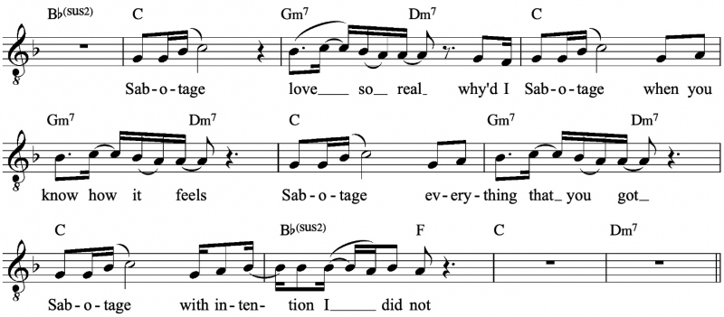 Sabotage is a beautiful song, captured with a beautiful performance, that elegantly uses instability in the musical patterns to enhance the unstable lyrical themes while providing just enough stability for balance. This is a great demonstration of prosody in action.