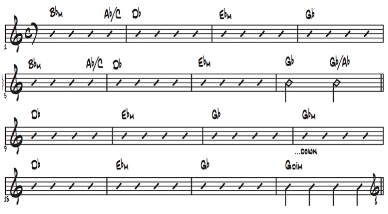 Figure 2 shows the chords for the verse, pre-chorus, and chorus. It starts in the key of Bb minor during the verse and pre, modulating to the relative major Db, for the chorus (bar 9), a modulation that creates a sense of uplift.