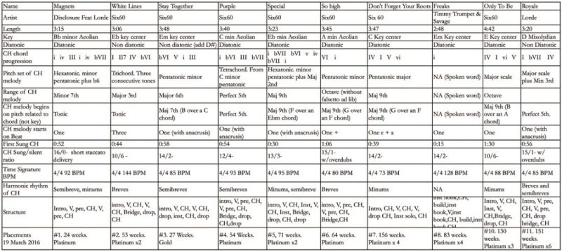 I narrowed my focus to investigate a manageable data range of just 10 popular songs in the current NZ music Top 20 that have charted for at least 24 weeks or more. I was eager to see if they shared some secret rhythmic ingredient or common melodic spice – other than just being written by Six60…