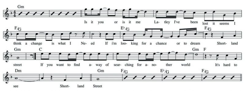 The abbreviated opening theme works efficiently on many levels to hook the audience in. The melodic rhythm is highly varied with subdivisions of the meter ranging from semiquaver to semibreve fusing rhythmic cells into strong three-note groups on beats one and three (utilising single weak note/word pickups in-between). These accentuate the contour of the couplet rhyme scheme setting up “me”, (the secondary “seems”) and “need” followed by the lovely assonate grouping “dream” and “street”.