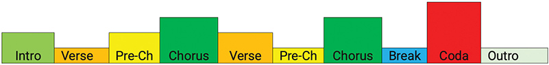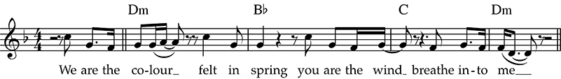 The first change occurs at the chorus, which is again built on a four-bar phrase that begins and ends on the tonic (Fig. 2). The stable feeling of being grounded remains. While the song is in a minor key it features far more major chords than minor. With the exception of a brief passing Am in the chorus and short appearance of a Gm in the breakdown, the tonic is the only minor chord in the song. The minor tonality and frequent use of major chords helps give its reflective, optimistic quality.