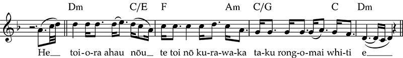 Similar changes in texture occur leading up to the second chorus before the breakdown strips the texture bare, paving the way for the emotional peak of the song in the coda. Here the full complement of backing vocals returns, with a string arrangement reinforced by the rhythm section. Over the top of all of this is Walker’s vocal, proclaiming ‘Hou mai rā, tō rongo e, Tau mai rā, Tō karere, Mau tonu e’ (Resounding are your deeds, received is your message. It remains.) The song ends like it began, with an opaque texture and minimal accompaniment, highlighting the main vocal. (Fig. 3)