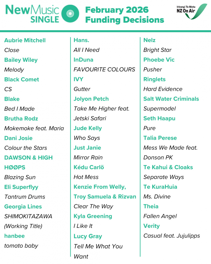 NZ On Air Music have announced results of the February 2026 New Music Single funding round, with 30 songs by local artists receiving grants of up to $11,000 to support the singles’ recording, video and promotion costs.