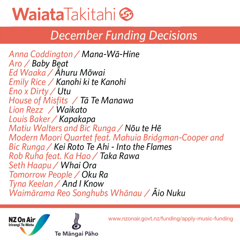 NZ On Air Music and Te Māngai Pahō have announced the recipients of their initial round of Waiata Takitahi – the new co-fund collaboration between the funding agencies for songs with a minimum of 25% te reo Māori lyrics.