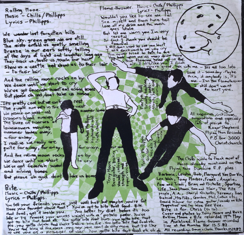 The song itself was released with B-side Flamethrower as a seven-inch single and it was the Chills’ first release after being one of the four bands on the 1982 ‘Dunedin Double’ EP. Despite having in its outro (from 3.44), possibly the best bit of catchy whistling, ever, in the Flying Nun catalogue, Rolling Moon only spent two weeks in the NZ charts and peaked at number 26.