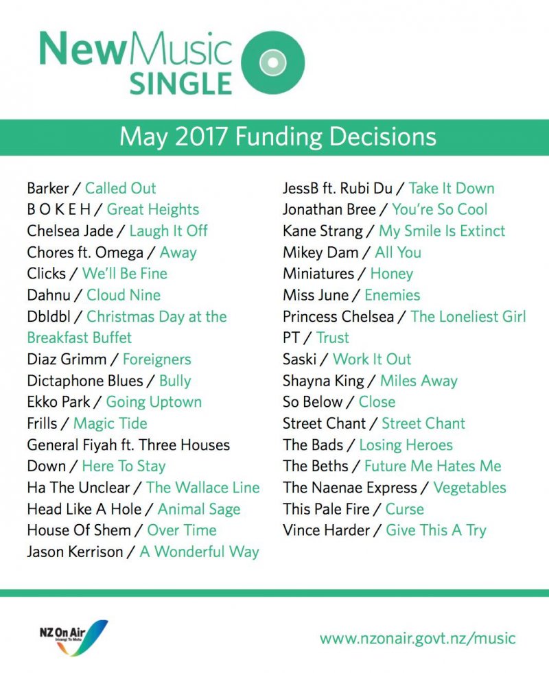 NZ On Air Music has published the results of its May 2017 New Music Single funding round.