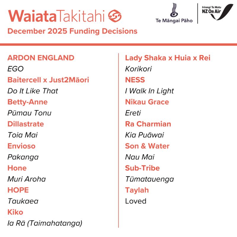 Results of the November 2025 Waiata Takitahi funding round have been announced with 15 waiata to benefit from grants of up $15,000 per single, to be released in the coming year.